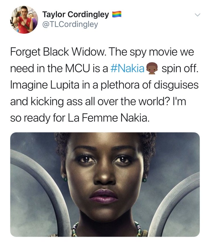 Plus we could get Shuri supplying her with ridiculous gadgets, and her constantly giving reports to Okoye and the rest of the Dora Milaje, while T’Challa tries to calm his nerves and not freeze every time they do whatever Shuri’s version of Skype is.